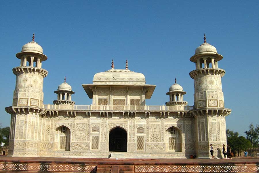 Itmad-ud-Daulah's Tomb (Baby Taj) It is a highly distinguished Mughal mausoleum, also called as "Baby Taj" and "Jewel Box". It has a large number of gardens and outbuildings that represent the transition period of Mughal architecture based on red sandstone and marble decorations. This great monument was constructed between 1622 and 1628 by Nur Jahan, the wife of Jahangir, for her father Mirza Ghiyas Beg. It is designed in a big cruciform garden criss-crossed by water courses and various walkways. The walls in the mausoleum are made up of white marble and contain various precious stone decorations made with topaz, jasper, onyx, cornelian and many others.